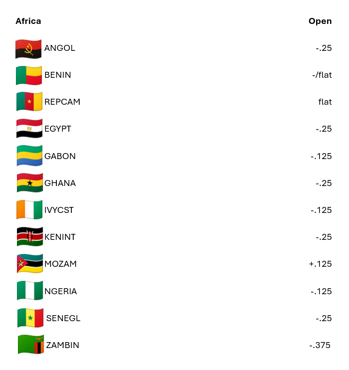 [17/10/25] Lower at the open as sentiment takes a hit on concerns about US regional banks. The space closed firmer, albeit off highs, on Thursday amid an increase in supply into the close. NGERIA (+.75) outperformed having lagged week-to-date while fellow oiler ANGOL (+.125) closed just higher; both heavy in early trading as Brent slips towards 60/bbl. ZAMBIN (+.75) also had a strong showing with 2053 notes particularly bid. SENEGL closed flat and trades .625pts down at the open as the IMF sees end-2024 debt at 132% of GDP including SOEs; the finance ministry had previously released the end-2024 figure at 119%, excluding SOEs.